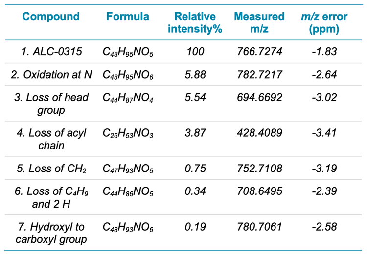 Structural elucidation of ALC-0315 and selected impurities