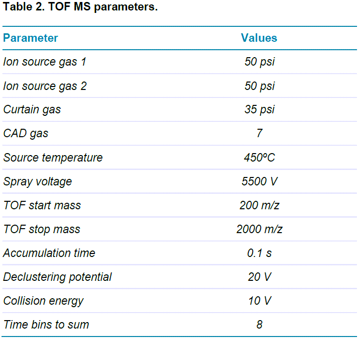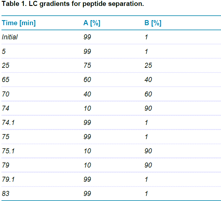 Chromatography: Peptides were separated using an ACQUITY CSH C18 column (2.1 x 150 mm, 1.7 µm, 130 Å, Waters), which was kept at 60ºC in the column oven of an ExionLC system (SCIEX). Table 1 shows the LC gradient used for peptide separation at a flow rate of 0.25 mL/min with mobile phases A and B consisting of 1% formic acid in water and 0.1% FA in acetonitrile, respectively.