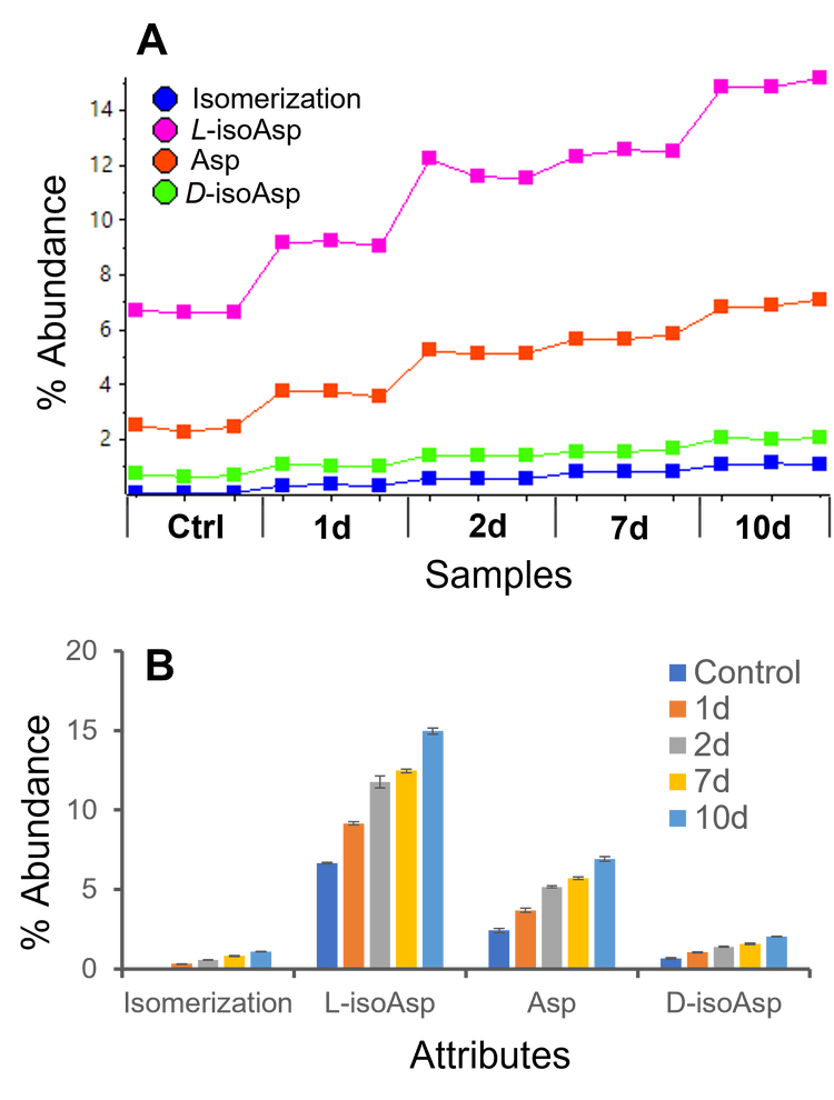 Sample preparation: The stock solution (10 µg/µL) of NISTmAb (reference material #8671, NIST) was aliquoted into 5 vials. One aliquot (control) was kept frozen and thawed prior to trypsin digestion. The remaining 4 aliquots of NISTmAb were heated at 60ºC for 1 day, 2 days, 7 days or 10 days, respectively. Trypsin digestion of the control and heat-stressed samples was performed following denaturation by guanidine-hydrochloride, reduction with dithiothreitol and alkylation using iodoacetamide. Each sample was analyzed in technical triplicates.