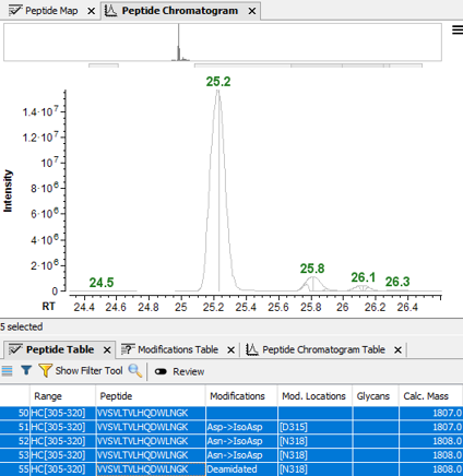 - Powerful software for peptide mapping: The Biologics Explorer software offers powerful algorithms and optimized workflows for peptide mapping and PQA selection