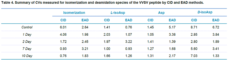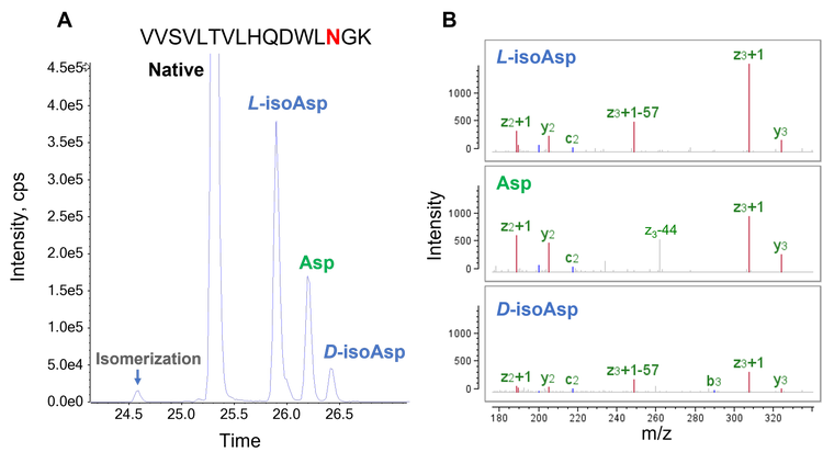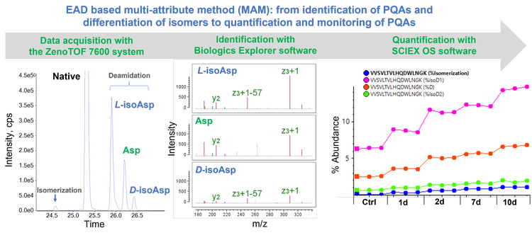 - Differentiation between Asp and isoAsp isomers from peptide deamidation, an essential class of PQAs that may affect a drug’s efficacy and safety, was achieved with a DDA platform method using EAD