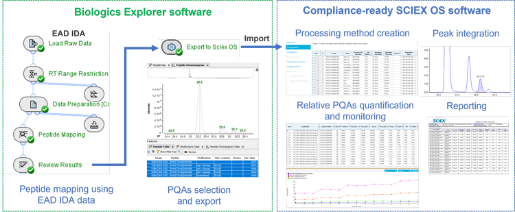 - Streamlined data flow: A customizable PQA list connects peptide mapping results in the Biologics Explorer software with PQA quantification and monitoring in a compliance-ready environment in SCIEX OS software