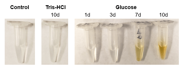 In this work, NISTmAb was thermally stressed in the absence or presence of glucose for up to 10 days. The discoloration was not observed for either the NISTmAb control sample or for the solution incubated with Tris-HCl buffer for 10 days (Figure 2). The NISTmAb samples incubated at 60°C in the presence of glucose did not develop discoloration until day 7 when the brown/yellow color became visible and grew slightly darker over the remaining time of incubation (Figure 2). This result demonstrates that the discoloration of protein therapeutics can be reproduced in the lab under harsh stress conditions, therefore enabling investigation of the cause of color change. Here EAD was employed to identify and subsequently quantify glycated peptides and AGEs in the time-course forced glycation samples to determine whether color change correlates with the degree of glycation or concentration of AGEs.