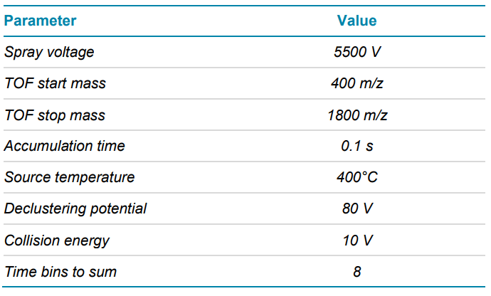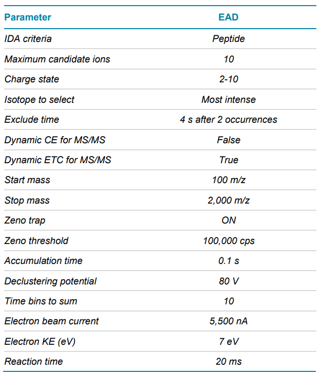 Mass spectrometry: Data-dependent EAD experiments were performed in SCIEX OS software using the ZenoTOF 7600 system. The key TOF MS and MS/MS settings are listed in Tables 2 and 3, respectively.