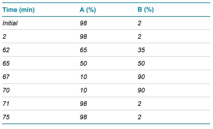 Chromatography: The peptides were separated with the gradient displayed in Table 1 using an ACQUITY CSH C18 column (2.1 × 150 mm, 1.7 µm, 130 Å, Waters). A flow rate of 0.25 mL/min was used for the peptide separation. The column was kept at 60°C in the column oven of an ExionLC system (SCIEX). Mobile phase A was 0.1% formic acid in water and mobile phase B was 0.1% formic acid in acetonitrile.