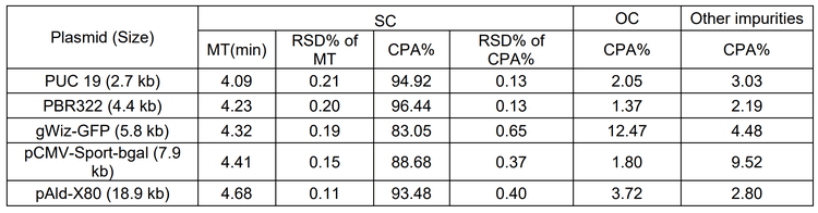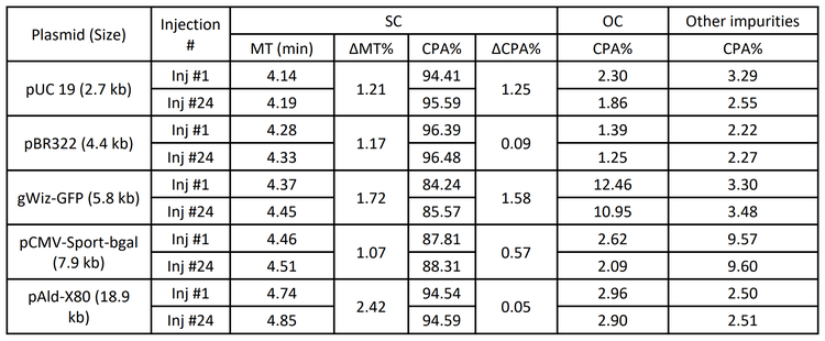 - High assay repeatability and reproducibility were demonstrated for plasmid isoform analysis with RSDs in MT and CPA% of <1% for 5 plasmids in 12 injections