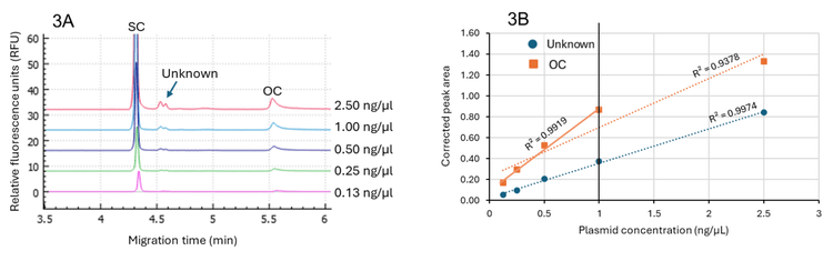 Determination of the optimal plasmid concentration for topological isoform analysis: The plasmid concentration needs to be optimized to achieve optimal results for topological analysis. A simple titration experiment achieves this optimization. For example, the gWiz-GFP (5.8 kb) plasmid was serially diluted from 2.50 ng/µL to 0.13 ng/µL with the DNA 20 kb Plasmid and Linear sample buffer. Samples at all dilution points were separated using the DNA 20 kb Plasmid and Linear gel on the BioPhase 8800 system. Results were analyzed using the BioPhase software with the minimum S/N set at 10. Figure 3A shows the overlay of the electropherograms obtained at different plasmid concentrations. The signal level for all peaks grew with increasing plasmid concentration while the peak profile remained consistent. The CPAs of the unknown impurity peak and OC isoform were plotted against the plasmid concentration in ng/µL (Figure 3B). The plot shows that the CPA of the unknown impurity has a good linear relationship with the plasmid concentration in the range of 0.13–2.50 ng/µL with an R 2 value of 0.9974 (blue dotted line). In the same plasmid concentration range, the R2 value for the OC isoform was 0.9378, indicating a suboptimal linear relationship between CPA and the plasmid concentration (orange dotted line). However, in the plasmid concentration range of 0.13–1.00 ng/µL, the R2 value for the OC isoform is 0.9919 (shown as the solid orange line), indicating a good linear relationship. Therefore, the plasmid concentration range of 0.13–1.00 ng/µL was determined as a good concentration range for this plasmid sample, with the 1.00 ng/μL concentration as the optimal concentration due to its strong signal. The same titration 4 experiment was performed for 4 other plasmids in this technical note. For all 5 plasmids, the 1.00 ng/μL concentration was determined as the optimal concentration and was used for further analyses.