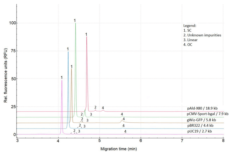 - High-resolution separation of plasmid topological isoforms and impurities across a wide size range (2.7- 18.9 kb): enables thorough characterization of plasmid isoforms and efficient analysis of plasmid purity and stability