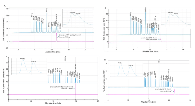 Materials: The DNA 20 kb Plasmid and Linear kit (P/N: 5311708) was from SCIEX (Framingham, MA) and contained DNA 20 kb Plasmid and Linear gel, DNA 20 kb Plasmid and Linear sample buffer, DNA 20 kb Plasmid test mix, SYBR™ Gold Nucleic Acid gel stain*, DNA 20 kb Plasmid and Linear conditioning solution, Acid wash/regenerating solution, and CE Grade water. The BioPhase BFS capillary cartridge - 8 x 30 cm (P/N: 5080121), the BioPhase BFS capillary cartridge - 8 x 50 cm (P/N: 5080123) and BioPhase sample and reagent plates (4,4,8) (P/N: 5080311) were from SCIEX. Rainin LTS filter tips were from Mettler Toledo (Oakland, CA). Nuclease-free water (NFW) (P/N: AM9932) and 1 Kb Plus DNA Ladder (P/N: 10787018) were obtained from Thermo Fisher Scientific (Waltham, MA).