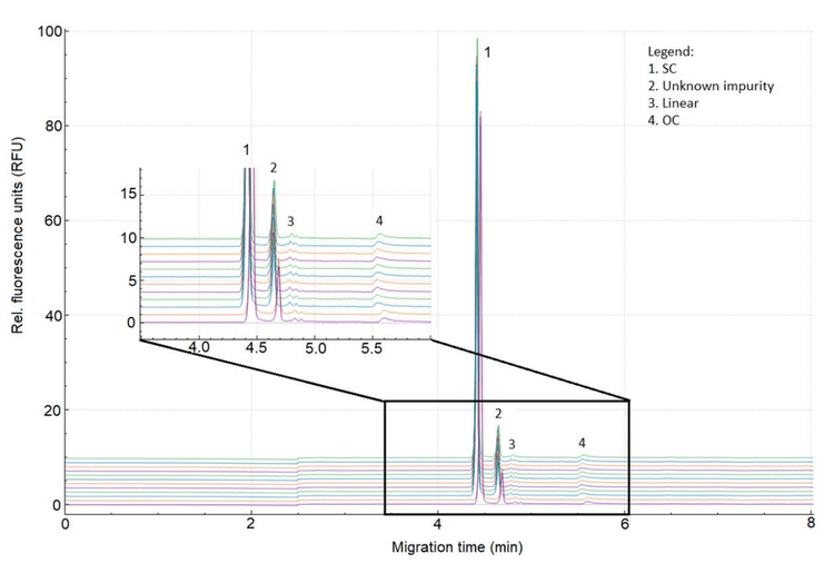 Excellent assay repeatability and reproducibility: Plasmids with sizes of around 7 kb are commonly used as raw materials for viral vector development in cell and gene therapy. Figure 1 shows the overlay of electropherograms obtained with 12 consecutive injections of a 7.9 kb plasmid from the same sample well. The inset shows a zoomed-in view of the overlay. The peak profiles are consistent across the 12 injections. The same experiment was carried out with 4 other plasmids with sizes of 2.7–18.9 kb. As shown in Table 1, the average MTs of the SC correlated well with the sizes of the plasmids, with longer MTs for bigger plasmid sizes. The SC% for pUC19 (2.7 kb), pBR322 (4.4 kb), gWiz-GFP (5.8 kb), pCMV·SPORT-βgal (7.9 kb) and pALD-X80 (18.9 kb) was 94.92%, 96.44%, 83.05%, 88.68% and 93.48%, respectively, indicating the ability of the assay to detect different purity levels in different plasmid samples with different sizes. RSDs for MT and CPA% for the SC isoform were better than 0.25% and 0.70% for all 5 plasmids in 12 injections, demonstrating excellent assay repeatability.