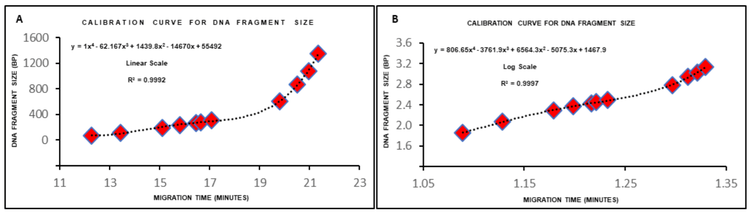 The ᵩX174 is a small, single-stranded DNA virus that infects Escherichia coli. It is also called a bacteriophage. It was the first genome to be sequenced. 3 Its replicative form (RF) is a double stranded circular DNA molecule of 5386 base pairs (bp). When it is digested by a restriction enzyme Hae III, 11 DNA fragments are generated.4 These fragments have been used as popular DNA standards for size determination of DNA fragments in the past 40 years. It is available from SCIEX as dsDNA 1000 Test Mix (PN 477414). Figure 9a shows the restriction map of ᵩX174 with Hae III sites, the origin of replication, and location of 11 genes indicated. Figure 9b is a representative electropherogram obtained by separation of the Hae III fragments of ᵩX174 on PA800 Plus using dsDNA 1000 gel, LIFluor EnhanCE dye and coated DNA capillary at 40.2 cm total length. Instrument set up and separation conditions were described in the Methods section. All 11 fragments including two fragments differing by 10 bps were baseline resolved within a 25 minutes run. As shown in Figure 10, a calibration curve was generated with results from Figure 9b. The best curve fitting was obtained with the quartic (4th degree polynomial) model with excellent R square values: 0.9992 at the linear scale (panel A) and 0.9997 at log scale (panel B).