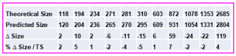 Notes: “∆ Size” is the difference between theoretical size and the size predicted using 1 kb plus DNA ladder. “% ∆ Size / TS” stands for percent size difference relative to the theoretical size.