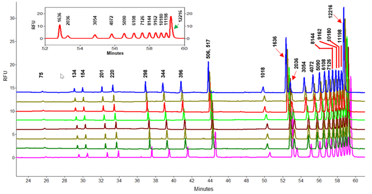 The 1 kb DNA ladder includes 12 large fragments created by repeating a 1018 bp fragment for 1 to 12 times. It also contains additional 11 fragments with sizes from 75 bp to 1636 bp that are generated by Hinf I digestion of a plasmid vector pBR322. For the 1 kb DNA ladder, the best separation was obtained with the separation voltage at 6 kv and a 40 cm effective length DNA capillary. As shown in Figure 12, an experiment was done to test method repeatability. The 1 kb DNA ladder at the concentration of 20 ng/ul was injected at 0.5 psi for 10 sec for 8 runs and separated using dsDNA 1000 gel and LIFluor EnhanCE dye. Each separation was performed at a voltage of 6 kv for 65 minutes with 20 psi pressure at both capillary ends. Results in Figure 12 showed that the peak patterns were consistent between the 8 different runs. Fragments under 500 bp with size differences of 20 to 50 bp were well separated. The picture inset in Figure 12 shows a zoomed-in view of the area where large DNA fragments with sizes of 1.6 kb to 12 kb were baseline separated as well. Good repeatability was demonstrated by the RSD% values for the 1636 bp peak: 0.43% for migration time and 2.19% for corrected peak area.