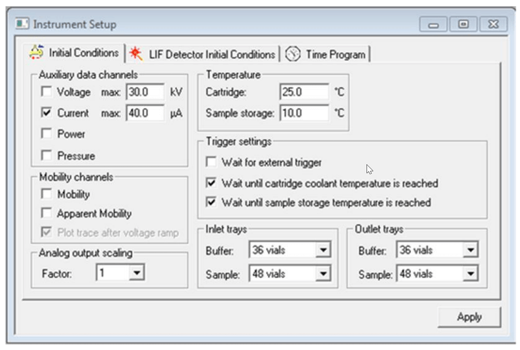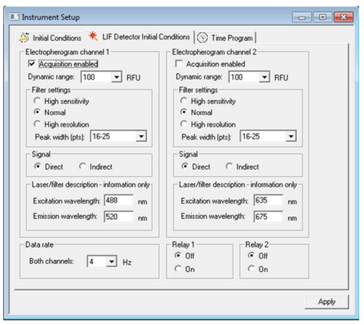 The “Initial Conditions” and “LIF Detector Initial Conditions” were set up as indicated in Figure 4 and Figure 5 respectively. Same set up was used for all three methods: Capillary Conditioning, Separation and Shut Down.