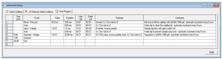 Figures 7 and 8 show time programs for separation and shut down methods for running the dsDNA 1000 test mix. For DNA fragments with sizes larger than 2 kb, the separation time was extended to longer time as indicated in figure legends.