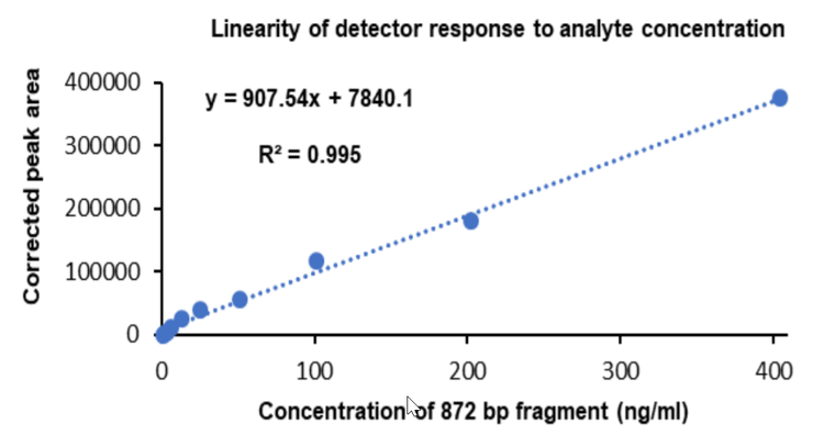 Further experiments were carried out to determine the limit of detection (LOD) and limit of quantitation (LOQ) as well as the linearity of detector response to concentration of the DNA sample in this method. The Hae III fragments of ᵩX174 were serially diluted by 2 fold each time and separated. Figure 11A shows the electropherograms obtained with some of the diluted samples. The concentration of the 872 bp fragment is indicated next to each electropherogram trace. The signal to noise ratio for the 872 bp peak was 5.4 at the concentration of 0.79 ng/ml, and 16.1 at 1.6 ng/ml. Therefore, the LOD is 0.79 ng/ml and the LOQ is around 1 ng/ml. Figure 11B shows that good linearity was obtained when plotting the corrected peak area of the 872 bp fragment against its concentration from 0.79 ng/ml to 404 ng/ml. The R square value was 0.995. The dynamic range was 2.7 log.