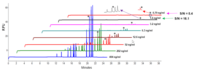 - Better sensitivity and assay repeatability for more consistent results with LOD of 0.79 ng/ml and %RSD of less than 0.5% for migration time and less than 2.5% for corrected peak area