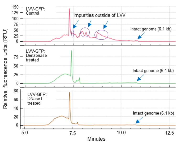 Figure 8 shows results obtained from an in-depth genome integrity analysis of LV-GFP obtained from a commercial vendor. The top panel shows control results that were obtained without treating the LVV sample before nucleic acid extraction. The middle panel shows results obtained when samples were treated with benzonase before extraction. The sample in the lower panel was treated with DNase I before extraction. The areas in purple circles indicate the impurities that were present outside of the LVVs, as these peaks were present in the control condition but not in the benzonase- or DNase I- treated samples.