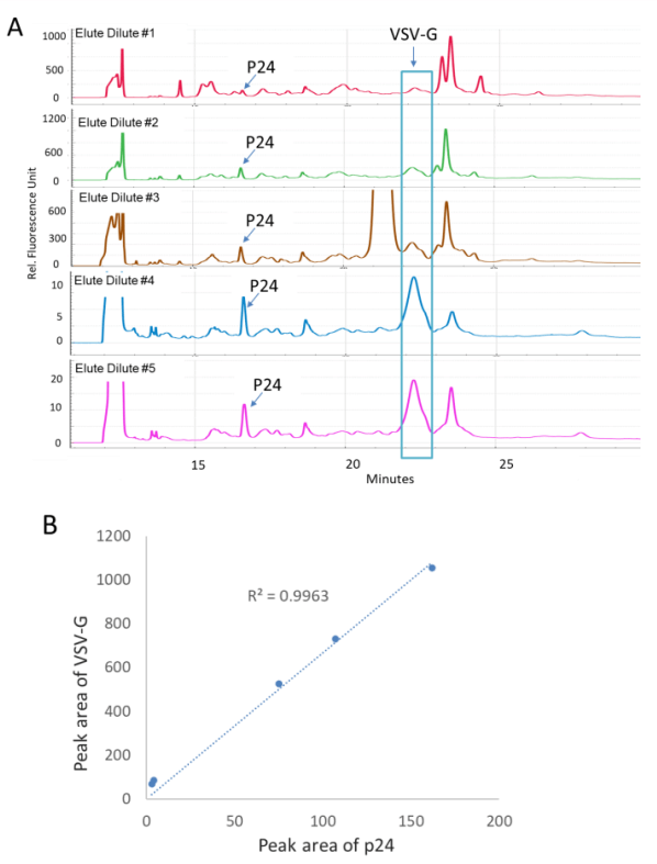 The identification of the p24 protein and VSV-G proteinwere confirmed by spiking p24 standard in the LVV samples when analyzing using the protein analysis CGE-SDS-LIF workflow and LC-MS analysis of the peak fractions (data not shown in this technical note). The formulation protein in the elute dilute sample #3 (Figure 3A) was a matrix protein added to the formulation buffer to stabilize the LVV. The quantification of the p24 peak in each inprocess sample can be used to monitor the downstream purification steps (Figure 3B). The relative quantification of p24 and VSV-G can be used to monitor the presence of free p24 in inprocess LVV samples. Figure 4A shows the zoomed-in electropherogram of the 5 in-process samples. The areas of the p24 peak and the VSV-G peak of each sample were plotted to reveal a strong correlation between p24 and VSV-G (Figure 4B). These results indicate that there was no free p24 present in these in-process samples.