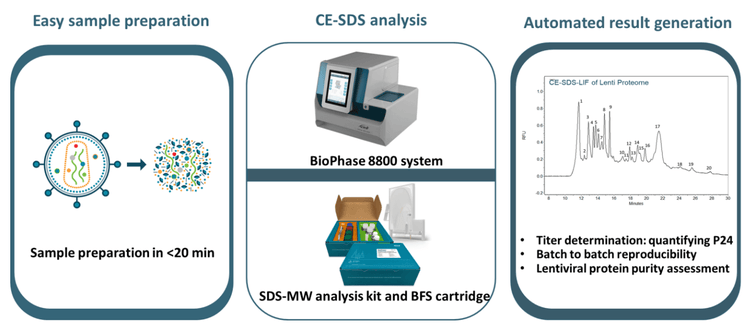 - Precise quantification of key proteins and informative proteome profiles were utilized for characterization and monitoring of the in-process LVV products using the SDSCGE-LIF workflow for protein analysisGenome integrity and residual nucleic acids were monitored for the eluting dilute of LVVs in different purification steps using the CGE-LIF genome analysis workflow