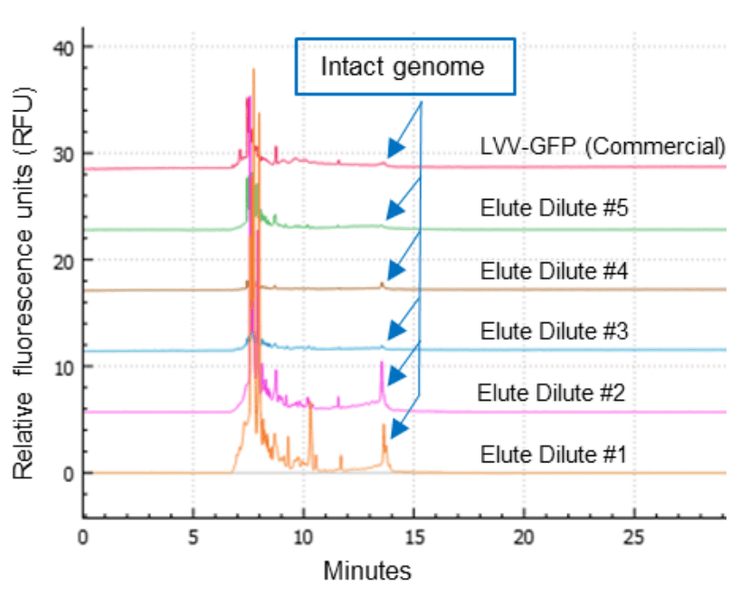 Figure 7 shows the results obtained for genome integrity analysis of the 5 in-process LVV samples together with a commercial LVGFP reference material. Samples were injected using pressure injection and separated at a capillary temperature of 30°C. The intact genome that separated from the small molecule nucleic acids can be used to monitor the genome integrity and the presence of residual nucleic acids in the samples during process development.