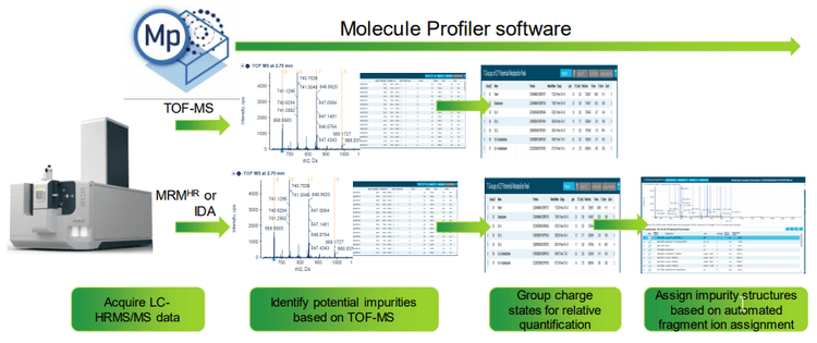 - Excellent quality and high mass accuracies for TOF-MS and TOF-MS/MS data allow for confident assignment of oligonucleotide FLP and impurities in Molecule Profiler software