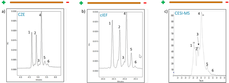 - Comparable separation of the charge variant with the widely accepted platform methods using optical detection, namely CZE-UV and cIEF