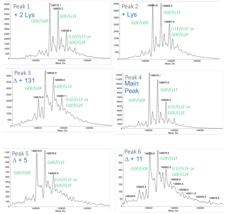Compared to the major form, basic variants in the solution has higher pI, therefore have more surfaces charges, while the lower pI acidic variants would have less surface charges in the same buffer environment. The CE separation conditions used in the CESI-MS method allowed for species with higher charges migrates faster and therefore smaller migration time. The deconvoluted MS spectra shown in Figure 3 correspond to each charge variant separated in the electropherogram on Figure 2c. This data reveals that Peak 1 and 2 have 258 and 129 Da mass shift relative to the main peak and were identified as Infliximab with two and one C-terminal lysine residues respectively . The migration time of Peak 3 indicates they are likely a group of species that’s slightly acidic than the single lysine variant but more basic than the main peak. Additionally, deconvoluted spectra reveals that peak 3 has a 131 Da mass shift relative to peak 2. The higher migration time combined with mass shift indicate that peak 3 is the deamidated form of the single lysine variant. Peak 5 and Peak 6 show minor sequential increases in mass, consistent with increased acidity possibly due to increasing number of deamidation. In addition, three major glycoform patterns can be assigned for each charge variant and the most abundant glycoform is G0F/G1F (Figure 3).