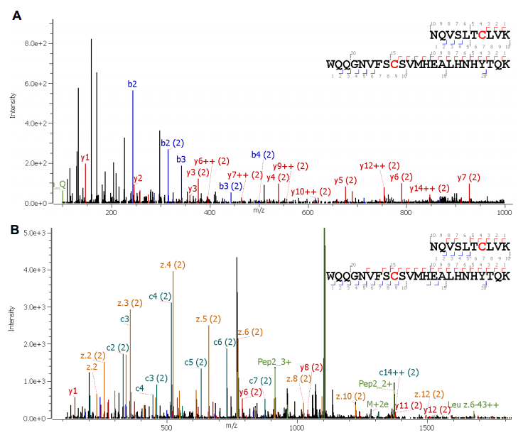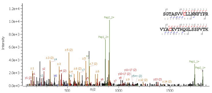 Figure 4 shows an example of an EAD spectrum for a disulfide linked peptide. The four most dominant fragments observed in the spectrum are the +1 and +2 charge states of the two linked peptides (SGTASVVCLLNNFYPR and VYACEVTHQGLSSPVTK) after the cleavage of the disulfide bond with EAD. The high resolution accurate mass data therefore provides clear information on which two peptides are connected by a disulfide bond. In addition, a great MS/MS amino acid coverage of the peptides was achieved with EAD, further enhancing the confidence in the assignment (86.7% for SGTASVVCLLNNFYPR and 93.7% for VYACEVTHQGLSSPVTK). Traditionally, disulfide-bonded peptides suffered quite often from low MS/MS scores for either both linked peptides or one of the peptides using CID due to the poor fragmentation. In contrast, EAD provides an incredibly high quality spectra for both linked peptides. For the peptide in Figure 4, high MS/MS scores of 590 and 418 for were obtained for SGTASVVCLLNNFYPR and for VYACEVTHQGLSSPVTK, respectively.