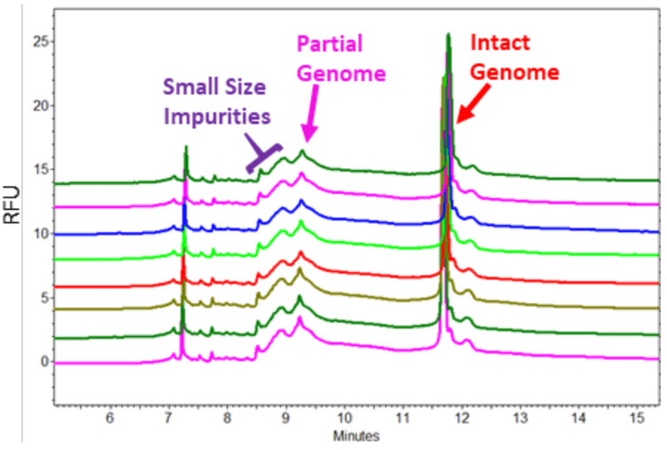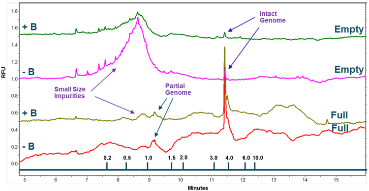 - Excellent separation resolution between intact and partial AAV genomes from small size impurities