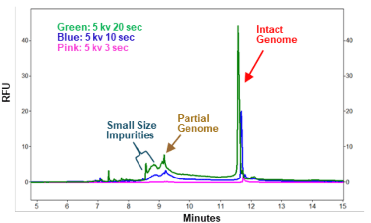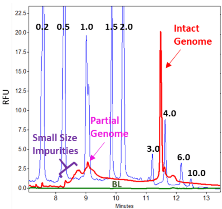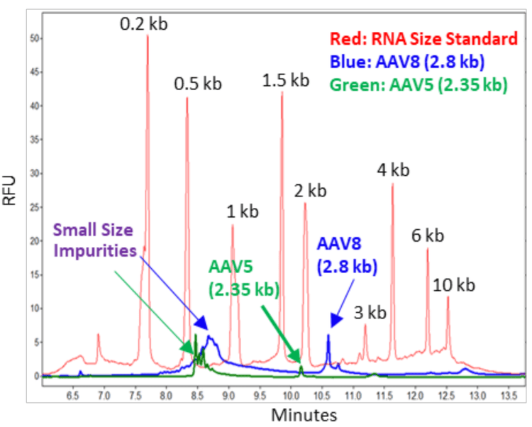 - Quick assessment of AAV genome size purity can be achieved in 30 minutes through a simplified, screening workflow, compared to hours with denaturing agarose gel or southern blot