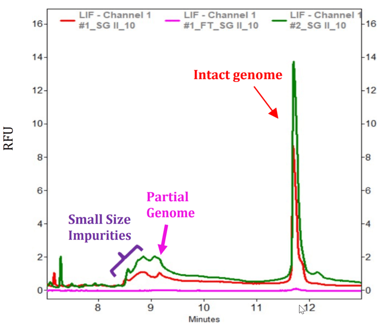 Adeno-associated virus (AAV) is a small (25-nm) virus that is composed of a non-enveloped icosahedral protein shell called capsid and a single-stranded DNA genome of about 4.7 kb. With its excellent safety profile and high efficiency in transducing a broad range of target tissues, AAV vector has become an attractive choice for gene therapy.1 Two recombinant AAV (rAAV) based drugs have been approved by the FDA: Zolgensma by AveXis for spinal muscular atrophy and Luxturna by Spark Therapeutics for inherited blindness. Many more are in clinical trial. One of the most commonly used methods for the production of rAAV vectors is the triple-transfection method which involves cotransfection of permissive cells such as HEK293 cells with three plasmids: one containing the transgene of interest flanked by the AAV inverted terminal repeats (ITRs), a packaging plasmid containing rep and cap genes, and a third plasmid encoding adenoviral helper genes. Gradient ultra-centrifugation is often used for purification of packaged rAAV vectors (Full capsids) from cellular debris contaminants, host cell DNA and RNA as well as Empty AAV capsids. However, remnants of contaminants can still be present in the viral vector product after purification. In addition, errors made in encapsidation of the intact genome containing the transgene during rAAV production can lead to heterogeneous populations with both intact genome and partial or smaller than unit-length genomes. The quality of Full capsids has a direct impact on the efficacy of the treatment including outcome of both preclinical and clinical studies. Therefore, it is crucial to accurately assess the quality and the correct length/size of the genome encapsidated in the vector. Verification of genome size has been traditionally done by denaturing agarose-gel electrophoresis and southern blot.2 Both are time consuming and with limited resolution on size determination. In this technical note, we describe the development of novel CE-LIF based methods for accurate determination of size purity of AAV genome. Our results indicate that these methods are capable of detecting intact and partial AAV genome as well as small size impurities.