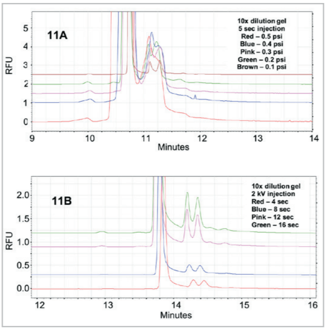 Capillary Condition Time Program: Capillary condition method was performed at the beginning of each sequence. Routine conditioning was done at 10 psi for 10 min with Gel/1x TBE/ dye buffer. If a new capillary was used, conditioning was done by rinsing six to eight times at 10 psi for 20 minutes with Gel/1x TBE/dye buffer. With optimized method using SYBR Gold, a 10 min rinse with methanol was done before the regular gel rinse.
