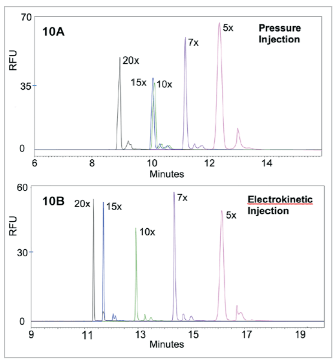 - Electrokinetic injection performed better than pressure injection due to more efficient injection of charged DNA analytes.