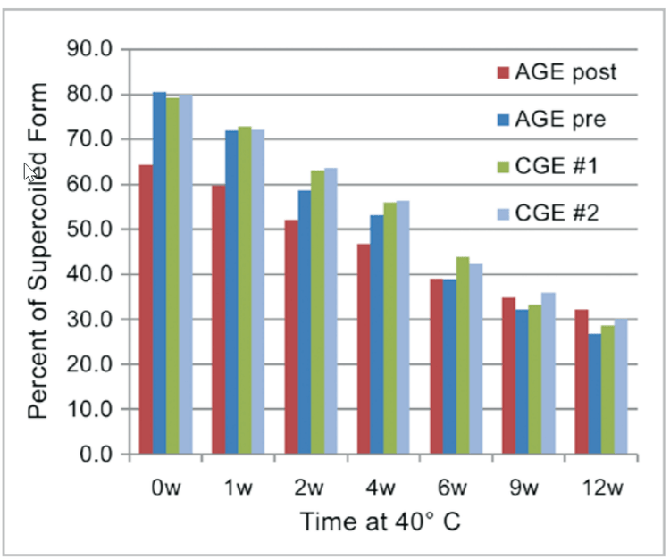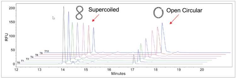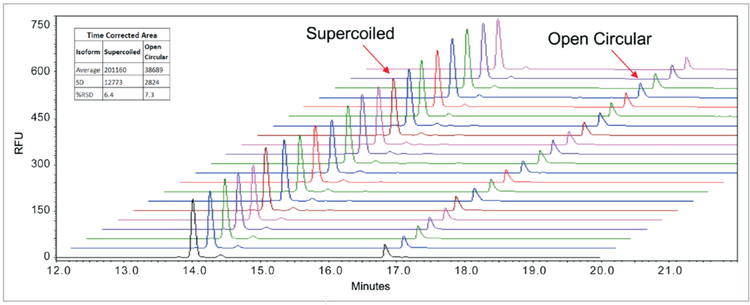 - Superb resolution of different plasmid isoforms with a 3-minute window between supercoiled and open circular.