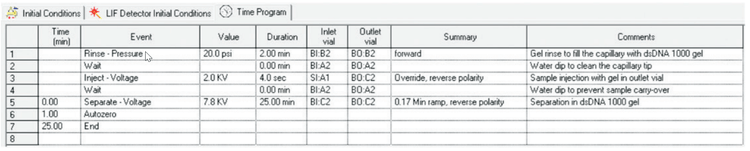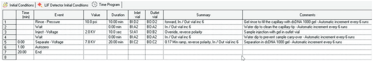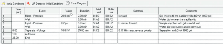 Shutdown Method Time Program: Shutdown method is performed at the end of each sequence. The capillary was rinsed with Gel/1x TBE/dye buffer at 10 psi for 20 minutes. The capillary was stored on the instrument at 20º C overnight or at 4º C for 2 to 3 days between runs. With optimized method using SYBR Gold, a 2 min rinse with methanol was done before the regular gel rinse.