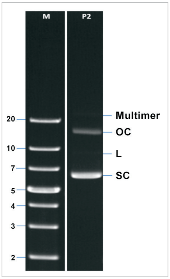 Plasmid analysis by agarose gel: Agarose gel was used for analysis of plasmid topology. In Figure 9, 200 ng of a plasmid sample (Lane “P2”) was run on a 1% TAE agarose gel containing ethidium bromide (PN 161-0433, BioRad). About 835 ng of 1 kb plus DNA ladder (PN SM1331, Thermo) was loaded in Lane “M”. The super-coiled (SC) and open circular (OC) forms generated good, sharp bands. The linear (L) and multimer forms were barely detectable. Therefore, although the agarose gel method is easy to do, it has a high detection limit. A capillary electrophoretic method would improve sensitivity in detection, providing automated quantitative analysis.