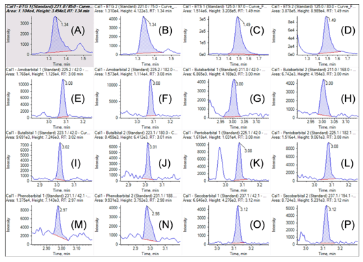 Materials: Compounds of interest include ETG, ETS, amobarbital, butabarbital, butalbital, pentobarbital, phenobarbital and secobarbital. Internal standards are ETG-D5 and ETS-D5 for ETG and ETS, and butalbital-D5 and secobarbital-D5 for the barbiturates.