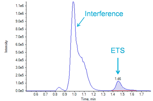 As previously stated, a fast LC gradient with a 5-min runtime was used in this method. Overall, both ETG and ETS had good retention using the developed LC conditions. In addition, baseline separation was achieved between a frequently observed strong interference for one of the monitored MRM transitions for ETS in urine samples (Figure 1).