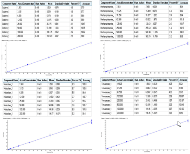 Figures 1 and 4 show typical chromatograms achieved using the described approach and quantitative results for the following analytes: codeine, methamphetamine, midazolam and temazepam. Excellent linearity and reproducibility were observed throughout the dynamic range assessed in this effort. Table 1 shows a summary of the calibration range for all 41 pain drugs. Within the listed concentration range, excellent linearity and reproducibility were achieved.