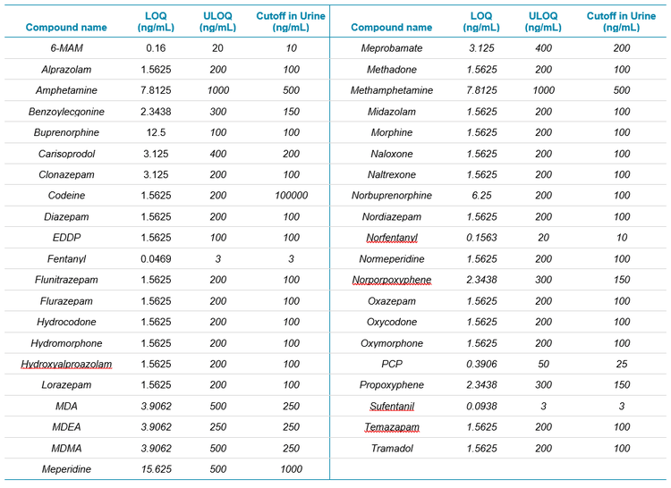 Liquid chromatography coupled to tandem mass spectrometry (LC-MS/MS) is a widely used analytical tool for screening and confirmation of drugs of abuse in forensic samples. The detection of several compound classes, such as the common pain drug panel and drugs of abuse is very important. While this analysis has generally been performed utilizing urine sample matrices, many research laboratories are investigating the analysis of these compounds in oral fluid matrices. Using oral fluid as a matrix provides several advantages over urine analysis. It provides a simpler collection procedure that can be witnessed which means there is less opportunity to adulterate the sample. Typical collection of oral fluid matrix involves a collection swab that retains the oral fluid matrix. After collection, the swab is subjected to extraction buffer. The resulting matrix is then analyzed for the drug compounds. The outcome for these investigations into the use of oral fluid needs to provide a means to accurately and precisely quantify compounds in a timely fashion, while having a simplified workflow that is conducive to their setting. This current effort has shown to accomplish just that. In this study we present a fast, robust, and reliable method that has afforded the detection of 41 compounds in an oral fluid matrix. The compounds included 6-MAM, alprazolam, amphetamine, benzoylecgonine, buprenorphine, carisoprodol, clonazepam, codeine, diazepam, EDDP, fentanyl, flunitrazepam, flurazepam, hydrocodone, hydromorphone, hydroxyalprazolam, lorazepam, MDA, MDEA, MDMA, meperidine, meprobamate, methadone, methamphetamine, midazolam, morphine, naloxone, naltrexone, norbuprenorphine, nordiazepam, norfentanyl, normeperidine, norpropoxyphene, oxazepam, oxycodone, oxymorphone, PCP, propoxyphene, sufentanil, temazepam and tramadol.
