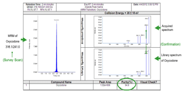The QTRAP LC-MS/MS System combined with the MPX 2.0 High Throughput System is a powerful tool for ultra-fast multi-analyte quantification and identification in forensic samples. A fast, robust and simple method for the detection of 41 common pain drugs in an oral fluid matrix was developed on this system, providing the high throughput required for today’s modern laboratories. Using the Scheduled MRM Algorithm in combination with acquisition of full scan MS/MS spectra for compound identification through MS/MS library spectral searching enables large numbers of analytes to be quantified in a single method.