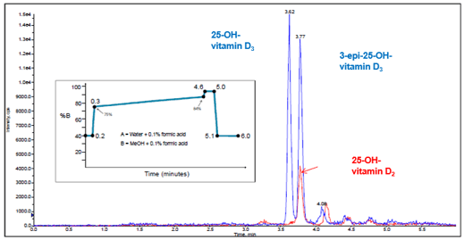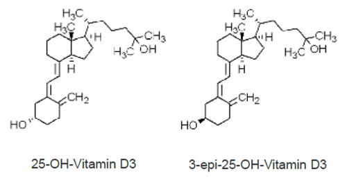 Because of the similarity in chemical structure (see Figure 1), 25-OH-vitamin D3 and 3-epi-25-OH-vitamin D3 display very similar chromatography and produce the same fragment ions when subjected to collisionally-induced dissociation (CID) in a triple quadrupole mass spectrometer. Since it is not possible to distinguish these epimers by tandem mass spectrometry alone, it is necessary to resolve these epimers chromatographically, to avoid the overestimation of 25-OH-vitamin D3 levels when analysis is performed by LC-MS/MS.