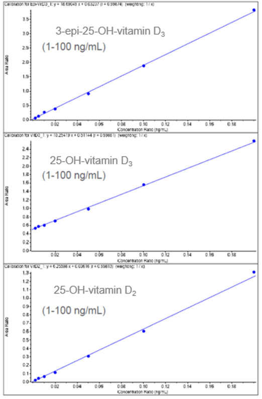 MS/MS conditions: MS/MS detection was accomplished using the SCIEX Triple Quad™ 4500 LC-MS/MS System, equipped with Turbo V™ Ion Source, operated in positive electrospray ionization (ESI) mode. The multiple reaction monitoring (MRM) mode of operation was used, with 2 MRM transitions monitored per analyte. The deuterated analogue of 25-OH-vitamin D3 was used as an internal standard for all the analytes.