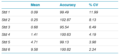 - Inter-day accuracy and precision, calculated using repeat analysis of serum calibrators over a long time period, was shown to be between 95.5–102.9% accurate with a %CV of ≤ 11.99 for all concentrations analyzed