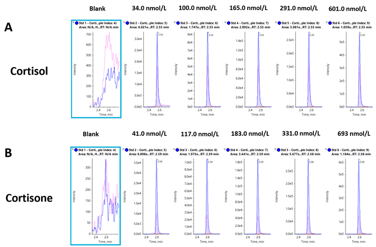 Figure 2 shows the XICs for A) cortisol and B) cortisone across their respective concentration ranges (34.0-601 nmol/L for cortisol and 41.0-693 nmol/L for cortisone). The peaks shown for the lowest matrix calibrators measured (34.0 nmol/L for cortisol and 41.0 nmol/L for cortisone) are well above the blank peak for both analytes.