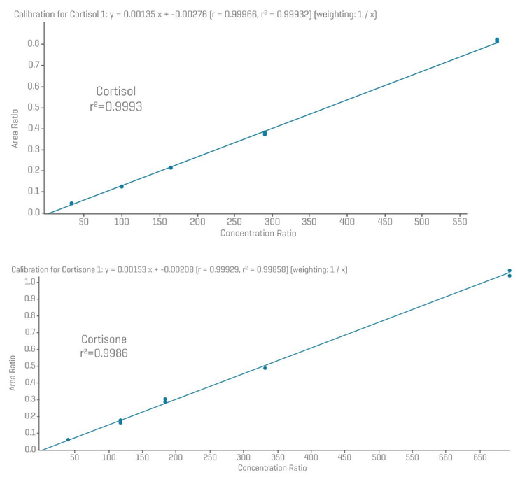 - Excellent linearity: Calibration curves for cortisol and cortisone showed r2 values above 0.99 across the calibration range (34.0-601 nmol/L for cortisol and 41.0-693 nmol/L for cortisone)