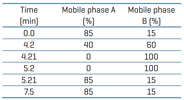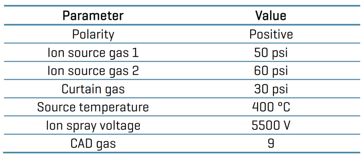 Liquid chromatography conditions: Chromatographic separation was achieved using a Phenomenex Luna Omega Polar C18 column (100 x 2.1 mm, 2.1 μm, 00D-4760- AN). Mobile phases A and B from the reagents set were used. The total run time was 5 min at a flow rate of 550 μL/min. The injection volume was 5 μL. The LC gradient program is presented in Table 1.