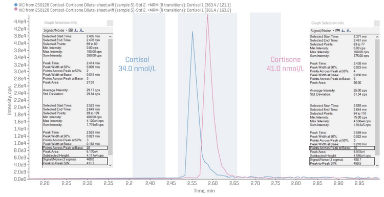 - Good sensitivity at the lowest calibrator level, resulting in S/N) of 412:1 for cortisol at 34.0 nmol/L and 460:1 for cortisone at 41.0 nmol/L