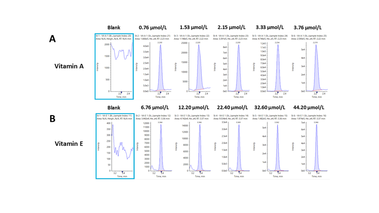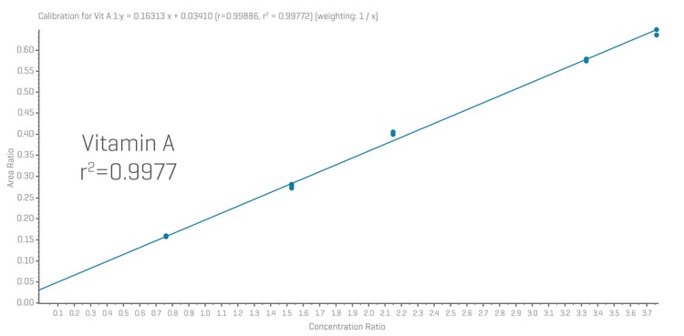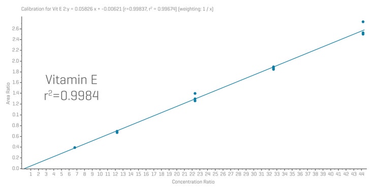 - Excellent linearity. Calibration curves for vitamin A and vitamin E showed r2 values above 0.99 across the calibration range (0.76-3.76 µmol/L for vitamin A and 6.76-44.20 µmol/L for vitamin E)